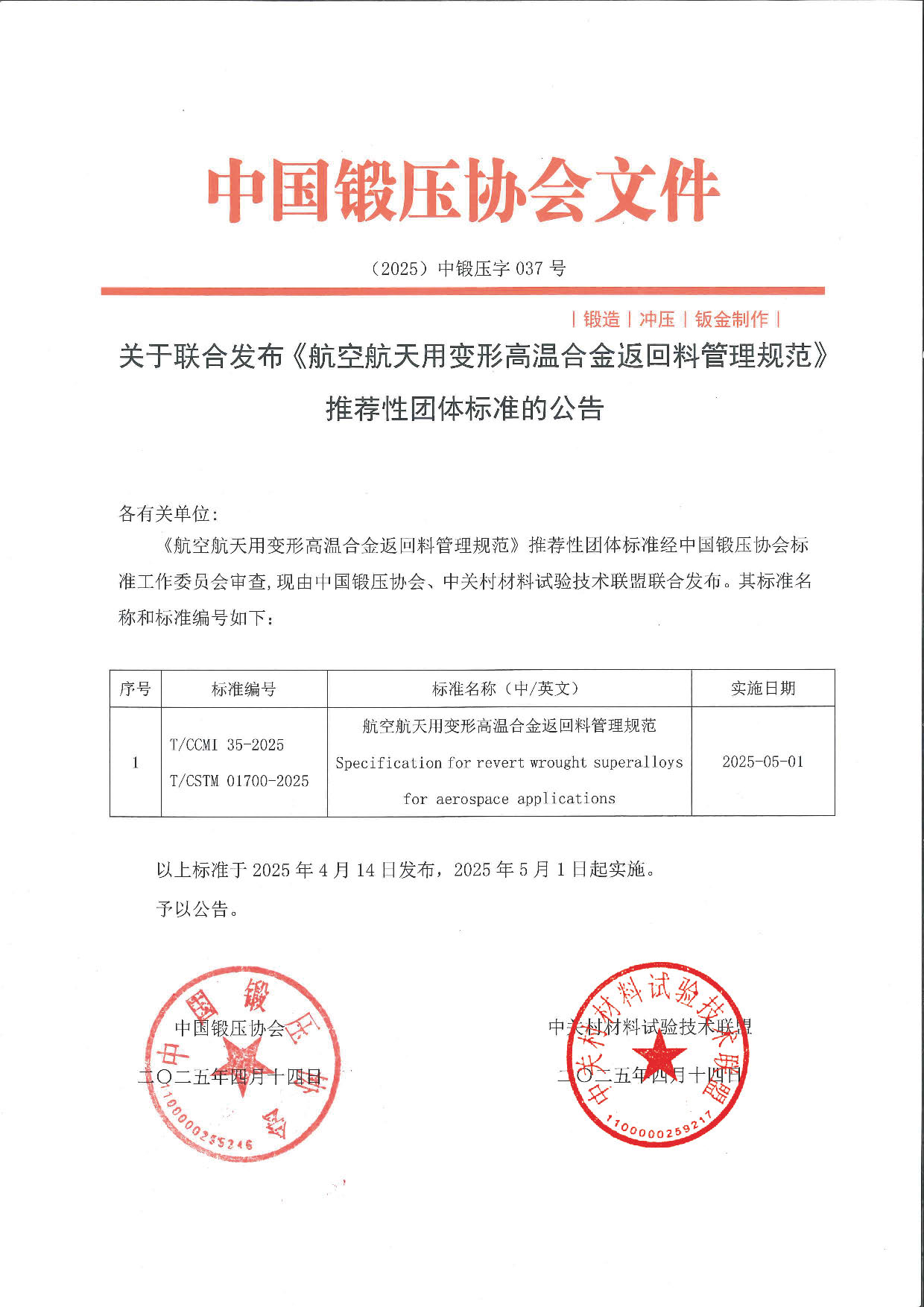 《航空航天用變形高溫合金返回料管理規(guī)范》推薦性團(tuán)體標(biāo)準(zhǔn)經(jīng)中國鍛壓協(xié)會(huì)標(biāo)準(zhǔn)工作委員會(huì)審查,現(xiàn)由中國鍛壓協(xié)會(huì)、中關(guān)村材料試驗(yàn)技術(shù)聯(lián)盟聯(lián)合發(fā)布。其標(biāo)準(zhǔn)名稱和標(biāo)準(zhǔn)編號(hào)如下: