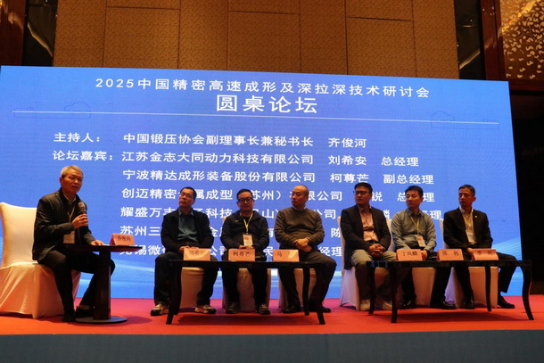 中國(guó)鍛壓協(xié)會(huì)副理事長(zhǎng)兼秘書(shū)長(zhǎng)齊俊河主持圓桌論壇,針對(duì)“1、高速精密沖壓工藝、裝備與模具技術(shù)難點(diǎn)及突破;2、深拉深工藝與裝備、模具、在線監(jiān)測(cè)技術(shù)的協(xié)同;3、微成形技術(shù)的應(yīng)用前沿與技術(shù)瓶頸;4、復(fù)合成形技術(shù)的未來(lái)發(fā)展趨勢(shì)”等議題,江蘇金志大同動(dòng)力科技有限公司劉希安總經(jīng)理、寧波精達(dá)成形裝備股份有限公司柯尊芒副總經(jīng)理、創(chuàng)邁精密金屬成型(蘇州)有限公司馬銳總經(jīng)理、耀盛萬(wàn)豐電子科技(昆山)有限公司丁鳳麟總經(jīng)理、蘇州三維精密金屬制品有限公司陳利副總經(jīng)理、無(wú)錫微研有限公司李民副總經(jīng)理等嘉賓分享了自己及所在公司在這些方面的真知灼見(jiàn)。