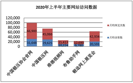 以下統(tǒng)計(jì)的流量主要來源于中國鍛壓協(xié)會(huì)官網(wǎng)、中國鍛壓網(wǎng)、維德視頻網(wǎng)、布魯助手網(wǎng)、鍛造網(wǎng)上展覽會(huì)等網(wǎng)站。通過這個(gè)統(tǒng)計(jì)可以粗略了解協(xié)會(huì)網(wǎng)絡(luò)的作用和必須堅(jiān)持的服務(wù)方向。作為專業(yè)性很強(qiáng)的行業(yè)網(wǎng)站,各網(wǎng)站的累計(jì)瀏覽量每月都可達(dá)到近20萬次。如圖1顯示的為2020年上半年各主要網(wǎng)站的月均訪客數(shù)及瀏覽次數(shù)。