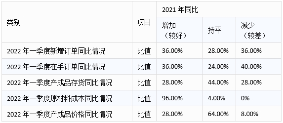 參與調(diào)研的鍛造裝備企業(yè)2022年一季度各項(xiàng)經(jīng)營指標(biāo)同比情況見表1.2。